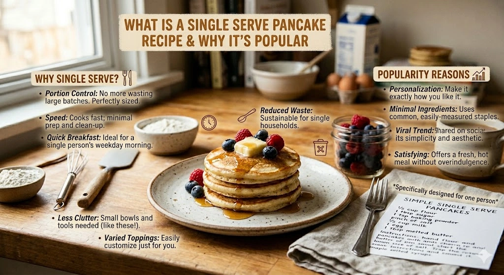 A single serve pancake recipe is exactly what it sounds like: a scaled down pancake batter designed to make 2–3 fluffy pancakes instead of a full family batch. It’s become popular because modern cooking is less about big batches and more about flexibility.
